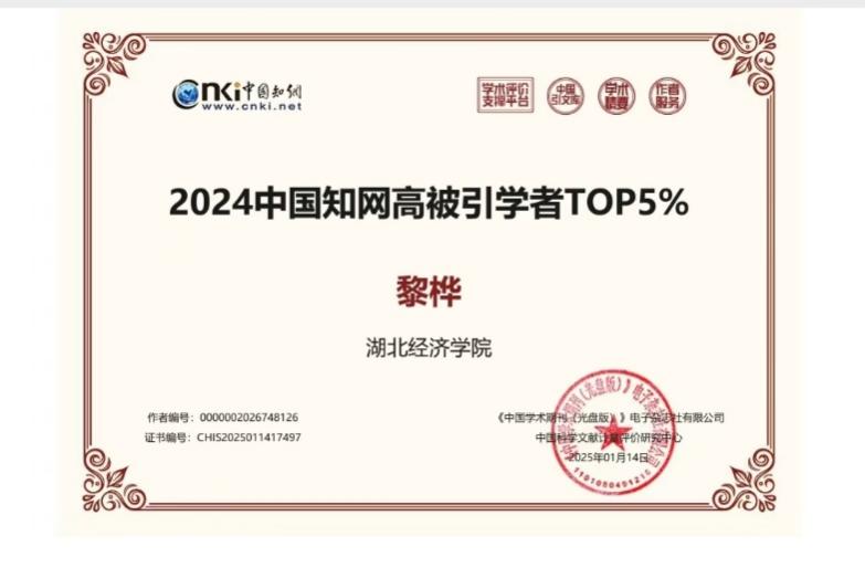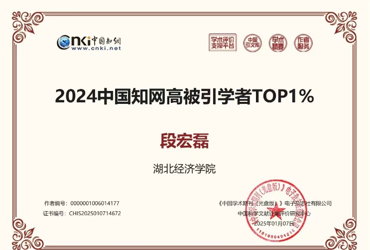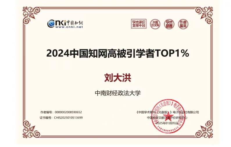 (通讯员:林小婷)近日,中国科学文献计量评价研究中心基于中国知网收录的国内学术期刊论文和会议论文,首次开展学者学术影响力客观评价,遴选出了“2024中国知网高被引学者”名单,全讯官网多位学者入选。600全讯白菜官方网站学术带头人、中南财经政法大学600全讯白菜官方网站教授、博士生导师刘大洪,600全讯白菜官方网站副院长、副教授段宏磊入选“2024中国知网高被引学者Top1%”榜单,黎桦教授入选“2024中国知网高被引学者Top5%”榜单。作为全球最大的中文文献数据库和知识服务平台之一,中国知网的此次遴选旨在客观、科学衡量并表彰近十年来国内科研成果丰富、学术影响力杰出的学者群体,在学术界引起广泛关注。