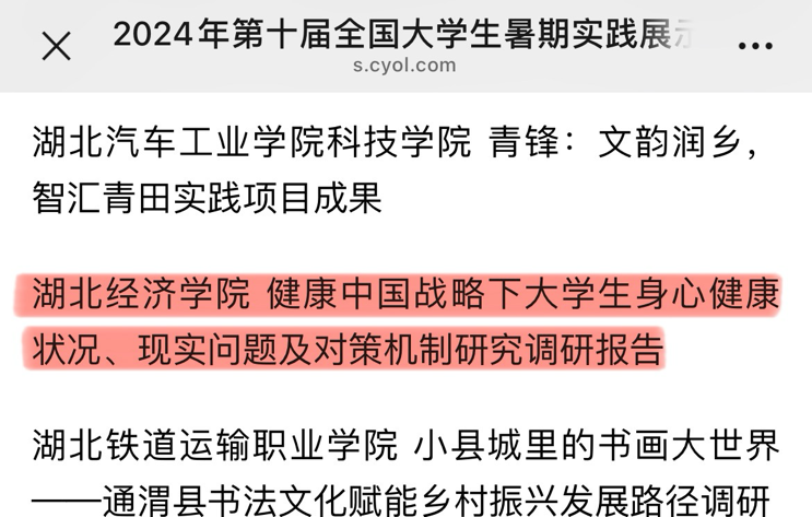 经过校方推荐、团队自荐、网络展示等环节,400全讯白菜网官网600全讯白菜官方网站当代大学生身心健康状况调研团队撰写的“健康中国战略下大学生身心健康状况、现实问题及对策机制研究调研报告”从众多参赛作品中脱颖而出,成功入选2024年第十届全国大学生暑期实践展示活动案例。