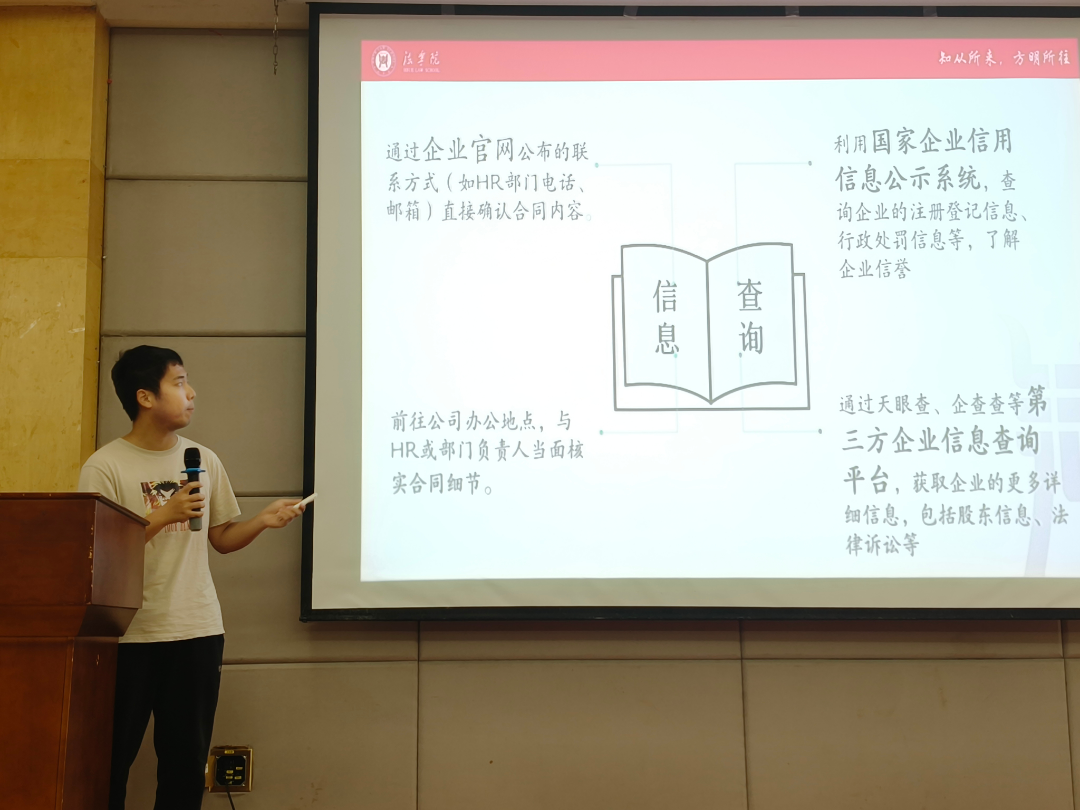 讲座中,阮子恒围绕实习协议与租房合同两大关键问题展开深入讲解。在实习问题部分,他以实习生小李的遭遇为例,详细阐述未签订规范实习协议可能引发的法律争议等问题。在租房合同部分的讲解中,阮子恒以2025年华中农业大学租房诈骗案引入,结合《民法典》和《刑法》相关法条,细致剖析其诈骗手段以及学生面临的困境。随后,他以常见租房合同样本为例,教导同学们识别合同陷阱,并提醒同学们选择正规平台租房,同时签订规范书面合同并保留证据。