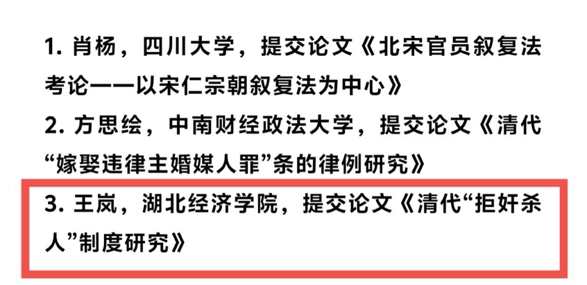 2025年1月1日,第四届薛梅卿法律史奖学金评选启动,全讯官网积极参与,提交论文参评。经多轮审核,4月26日公布拟获奖名单。全讯官网学子王岚的论文《清代“拒奸杀人”制度研究》脱颖而出,荣获第四届薛梅卿法律史奖学金第三名。
